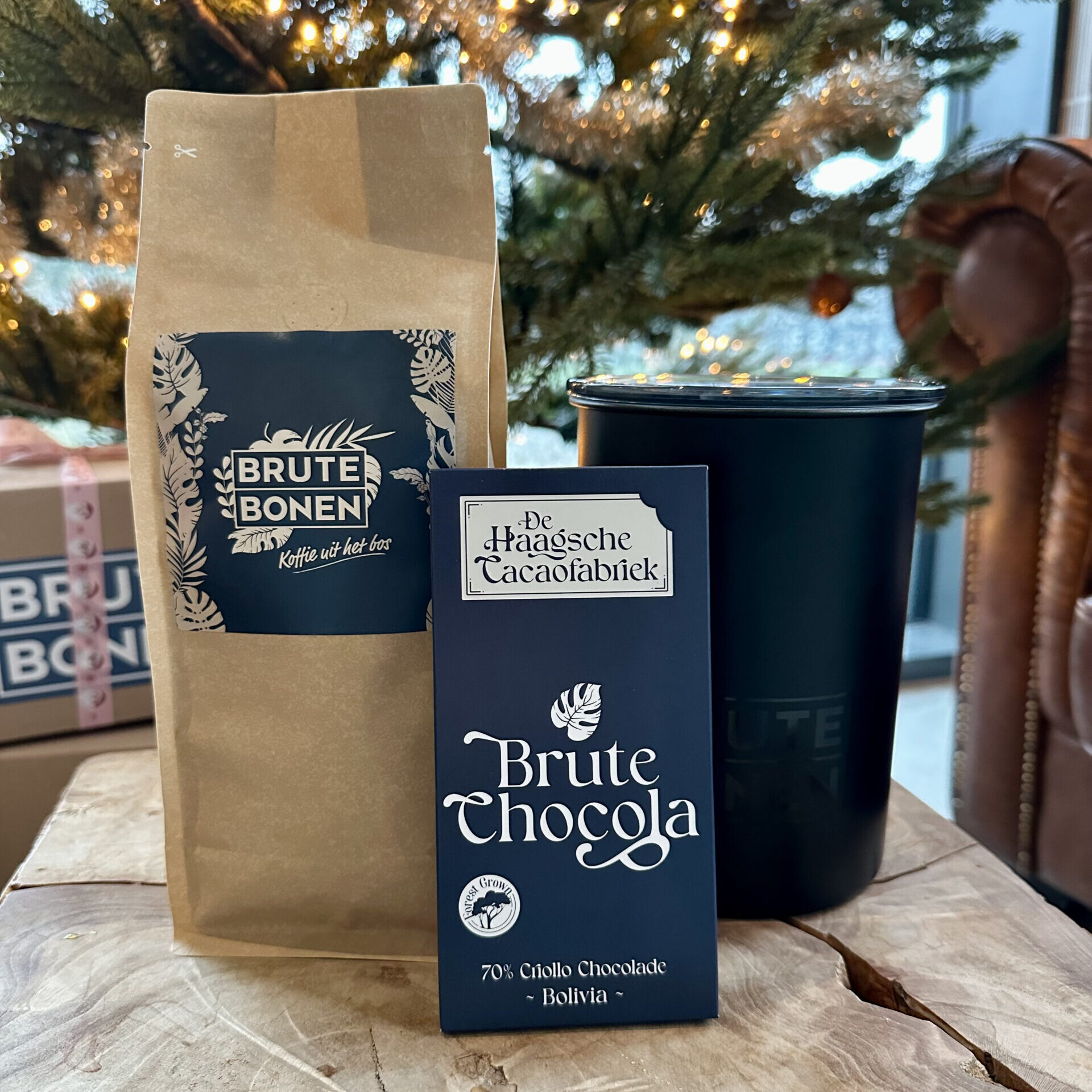 Het Brute Bonen Kerstpakket. 500 gram knetterverse koffie, een stoer bewaarblik én een brute chocoladereep. Precies wat je nodig hebt om december nóg lekkerder maken.